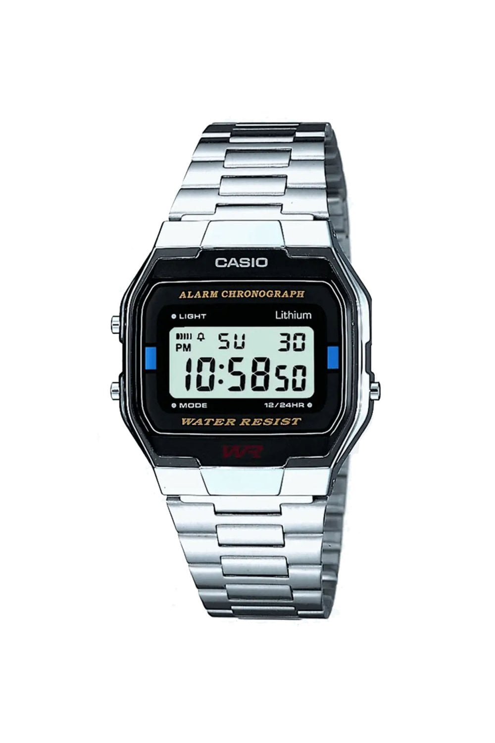 A classic CASIO design, part of the Vintage Retro Collection. This timepiece features a digital display, an Illuminator, daily alarm, and stopwatch. Resistant to minor splashing.