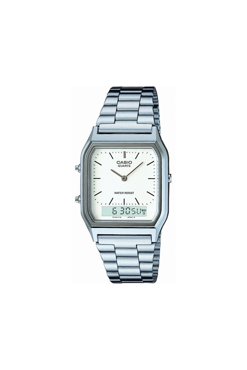 A stylish classic CASIO design, part of the Vintage collection, this timepiece features a digital and anologue display, dual time mode, a stopwatch and useful alarm. It is resistant to minor splashing and perfect for everyday wear. A silver coloured band completes the look.