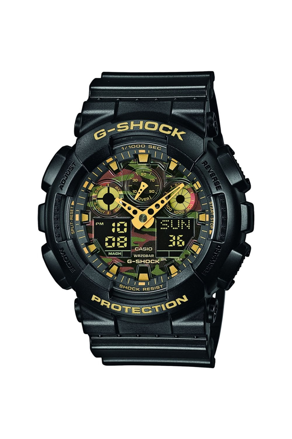 The GA-100CF-1A9ER is beautifully finished in black with a khaki design on the face, reverse LCD display, gold coloured accents, and a black strap for a distinctive look. Over-sized buttons come with a checkered anti-slip surface to make operations fast and sure.