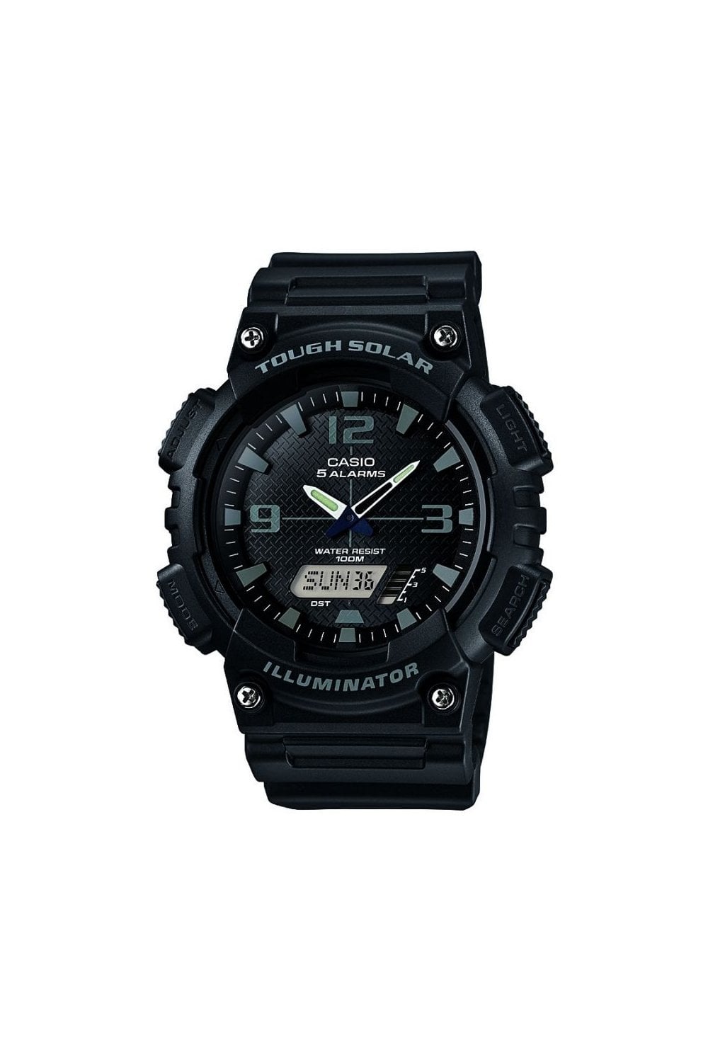 This classic CASIO timepiece is powered by Tough Solar and features 2 countdown timers, a stopwatch, 5 alarms and world time mode. The watch is housed in a durable resin case and is 100M water resistant.