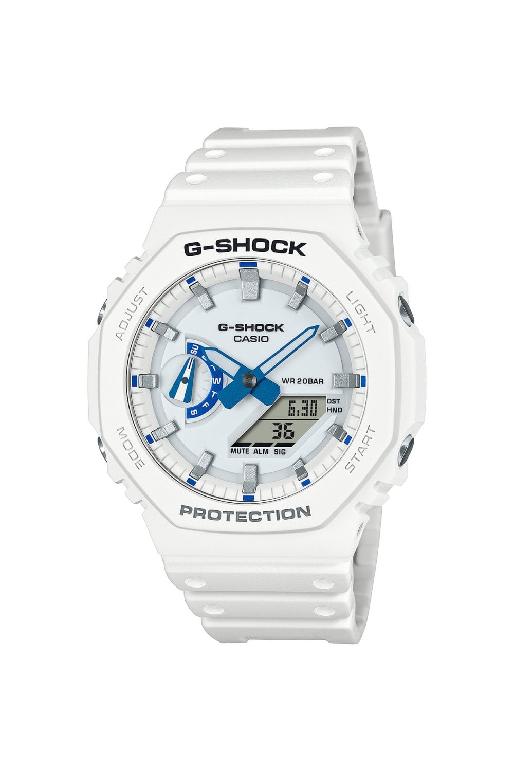 A clean white edition of the popular “CasiOak” series. The GA‑2100HDS‑7AER combines a slim octagonal case with lightweight comfort and modern ana‑digi functionality.