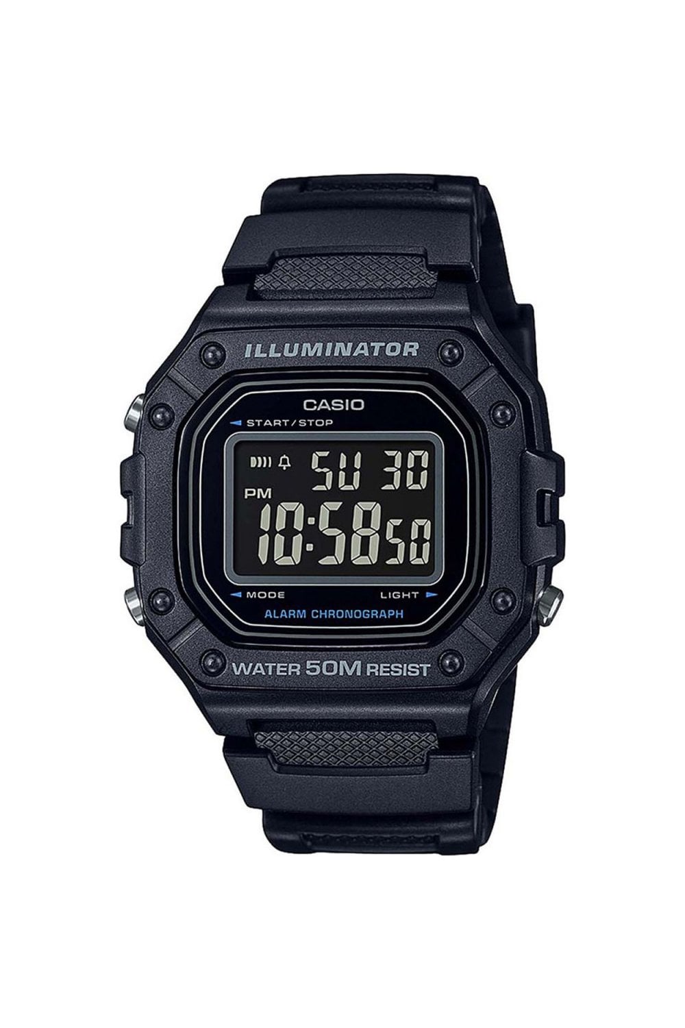The Casio classic digital watch. The timepiece is housed in a durable resin case and has a resin strap and water Resistant to 50M.