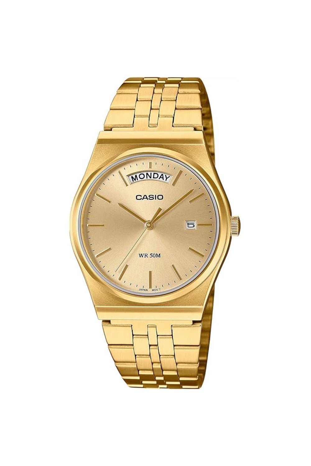 The Casio MTP-B146G-9AVEF is a stylish unisex wristwatch that blends retro charm with modern simplicity. Featuring a gold dial set within a gold-tone stainless steel case and bracelet, it stands out with a unique day display positioned at 12 o’clock and a date window at 6. The brushed finish adds texture and depth, while the mineral glass offers durability. With 50-metre water resistance and a compact 35mm case, it’s a versatile everyday timepiece that balances vintage aesthetics with practical design.