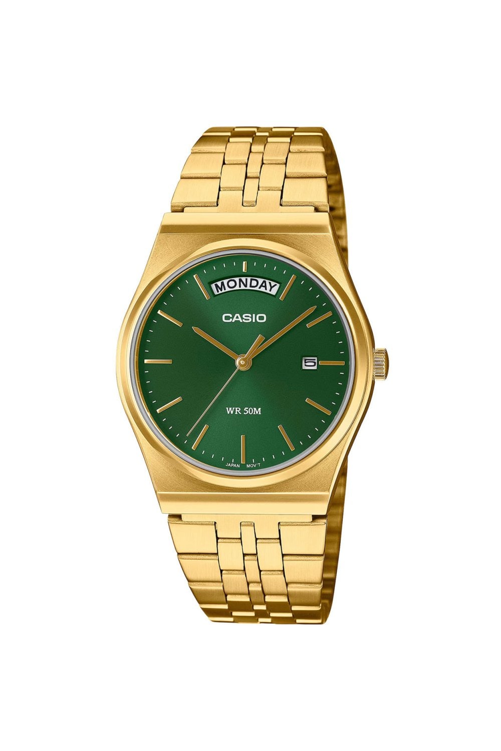 The Casio MTP-B146G-3AVEF is a stylish unisex wristwatch that blends retro charm with modern simplicity. Featuring a rich green dial set within a gold-tone stainless steel case and bracelet, it stands out with a unique day display positioned at 12 o’clock and a date window at 6. The brushed finish adds texture and depth, while the mineral glass offers durability. With 50-metre water resistance and a compact 41mm case, it’s a versatile everyday timepiece that balances vintage aesthetics with practical design.