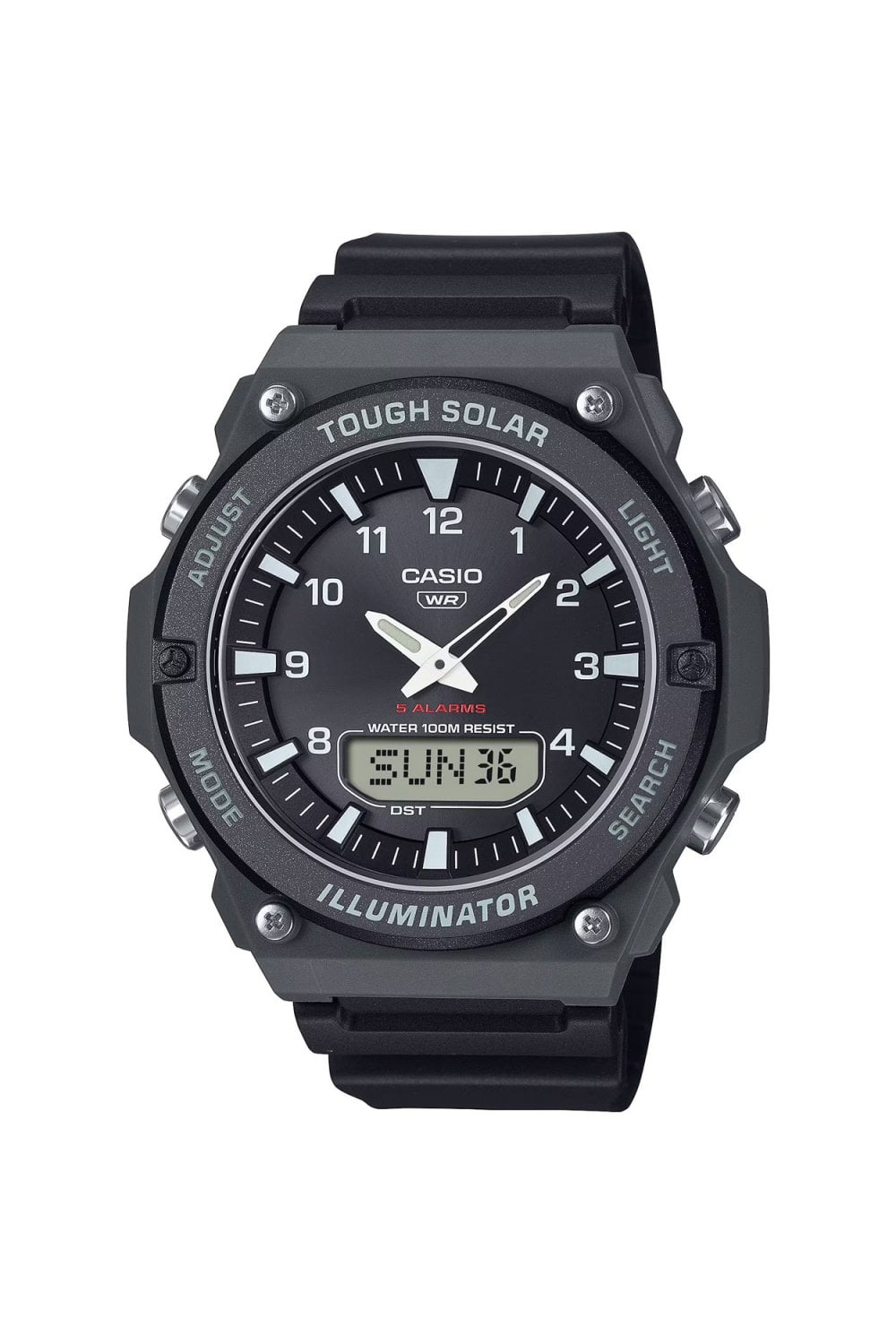 Built for durability, it features a rugged resin case and is water resistant up to 100 meters.