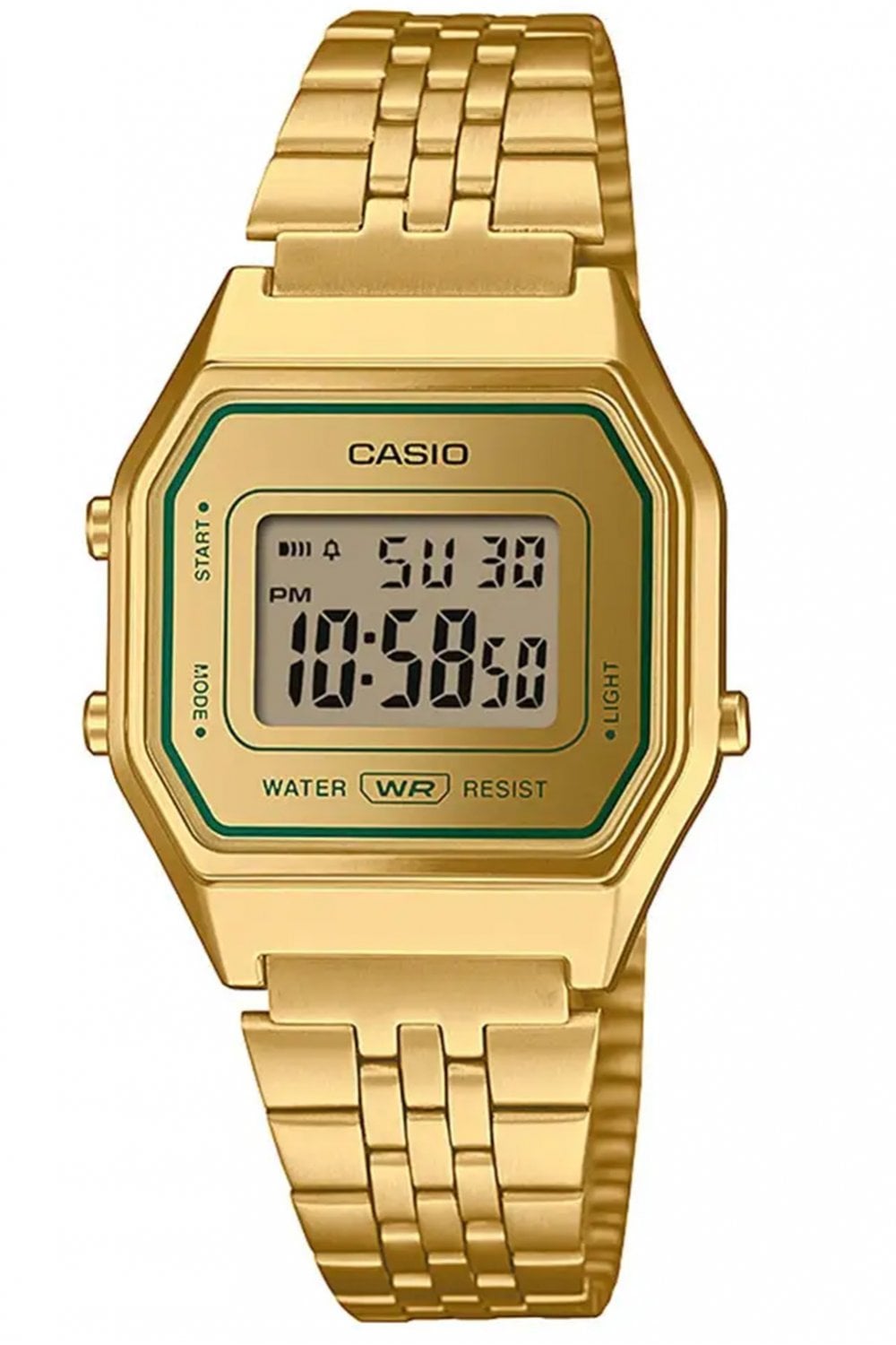 Introducing the new LA680WEGV-9AEF a perfect blend of retro and modern, with a grey face, gold case, and a uniquely shaped metal band featuring oblong horizontal links. A versatile classic for any occasion.