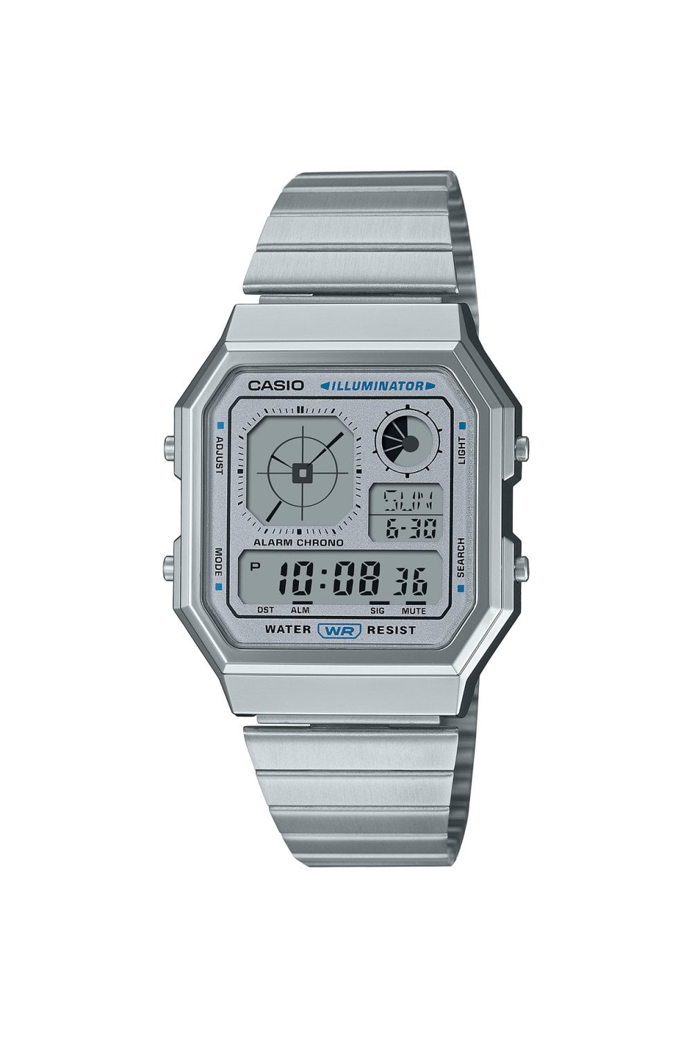 Step into the future with a nod to the past! With an updated take on the gadget-heavy aesthetics of the 1980s, blending a retro-futuristic vibe with analogue-inspired clock displays.The metallic finishes transform these watches into bold fashion statements, perfect for showcasing your unique style. The LCD design balances digital and analogue functionality, featuring a home-time analogue-style clock in the upper left and a graphic on the upper right tracking various features. The LED backlight ensures optimal visibility even in the dark.A sharp, angular case pairs effortlessly with a metal band, creating a compact, versatile design that complements any wardrobe/p>Key features include Multi Time, World Time, and an LED backlight—everything you need in a watch that’s as stylish as it is functional/p>