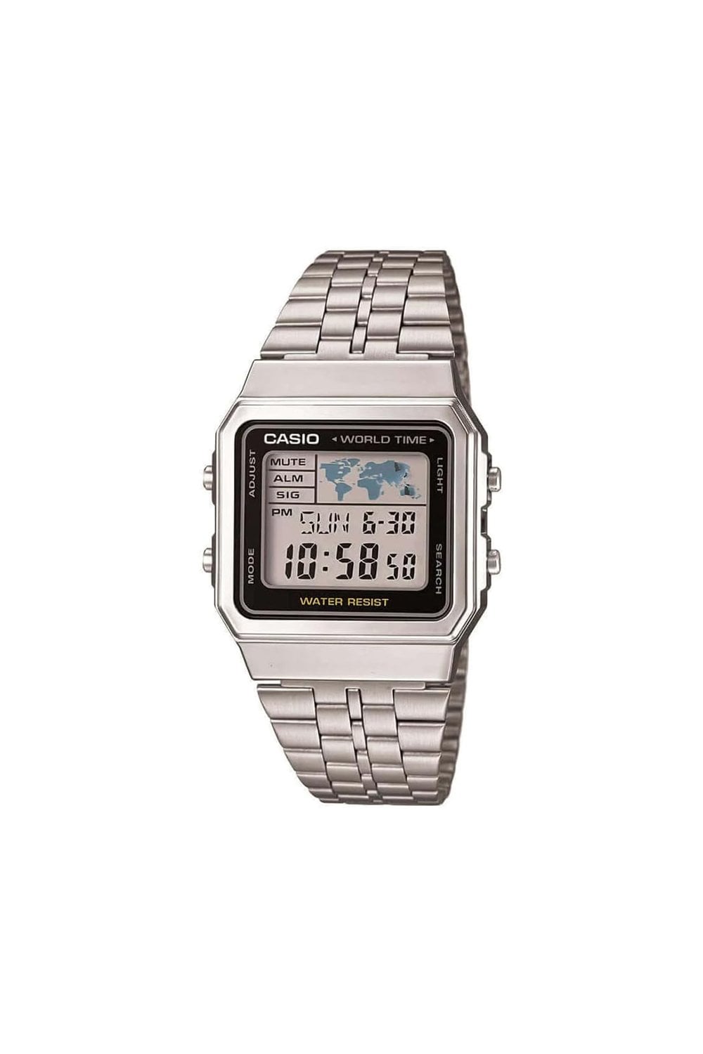 Perfect for every traveller. This watch is splash-proof and comes with World Time and a world map feature, LED light, 5 alarms, a stopwatch and is finished with an adjustable stainless steel bracelet.