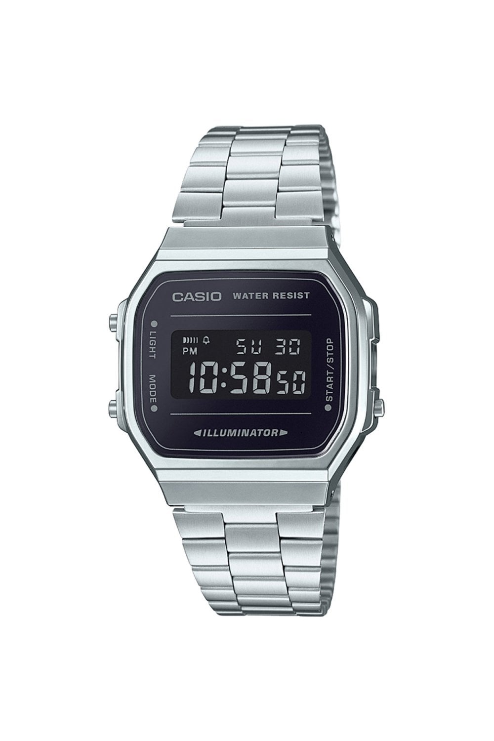 A classic Casio design, part of the Vintage Retro Collection. This timepiece features a digital display, an Illuminator, daily alarm, and stopwatch. Resistant to minor splashing and has a black mirror face.