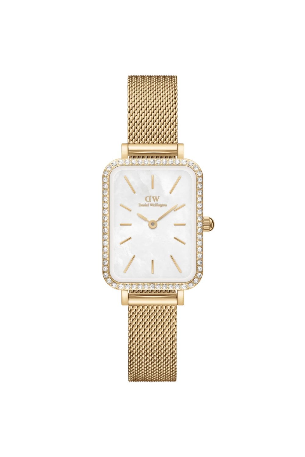 An elegant rectangular ladies’ watch from the Quadro collection, designed with jewellery-inspired detailing. The polished gold-tone stainless steel case (20mm × 26mm) is framed by a bezel set with crystals, adding subtle sparkle. The white mother-of-pearl dial enhances the luxurious aesthetic, while slim gold-tone hands and indices maintain Daniel Wellington’s minimalist Scandinavian style.