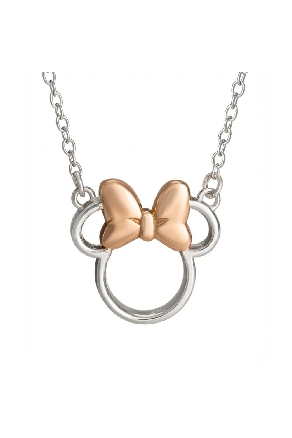 Celebrate timeless Disney charm with this elegant Minnie Mouse necklace. The polished silver‑tone outline of Minnie’s iconic silhouette is paired with a warm gold‑tone bow for a playful yet sophisticated finish. Perfect for gifting or adding a touch of magic to everyday style.
