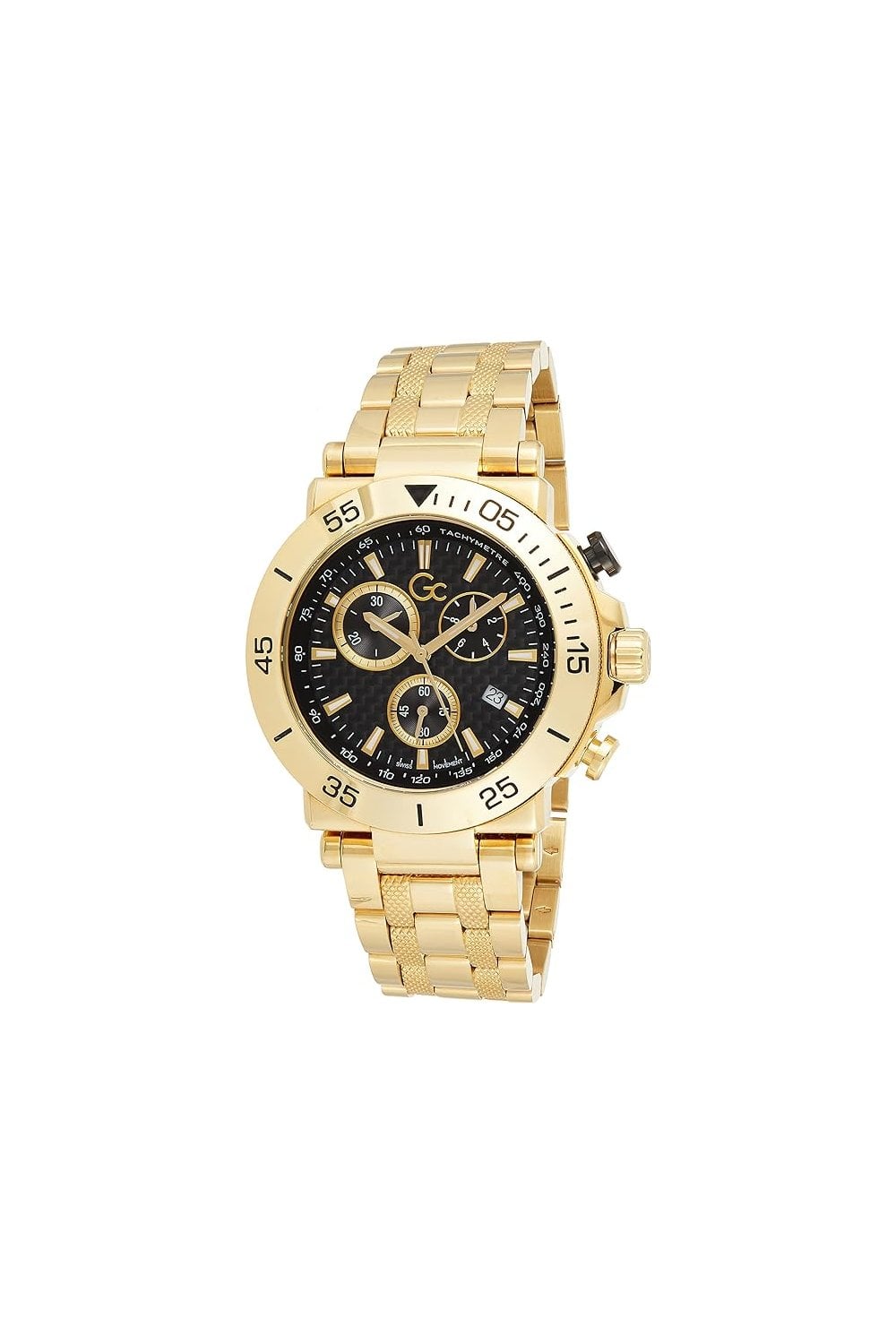 Gc Gents watches are all about looking great. Each Gc watch reflects modern trends in true Gc style, with bold and irresistibly sleek designs available across the collection. Add a new lease of life to your look with this gents dress style watch from Gc. Featuring a stunning analogue black face in a 44mm diameter 12mm thick case. Also boasting the well-known Gc features, including Chronograph, Date window, Swiss Movement, Screw down Crown, Mineral Glass and Water-Resistant. With a fully adjustable PVD plated stainless steel bracelet. This watch is water resistant up to 100 metres. It also comes in its own Gc Gift Box making it the perfect present. All this with a 2-year Manufacturers Guarantee for added reassurance.