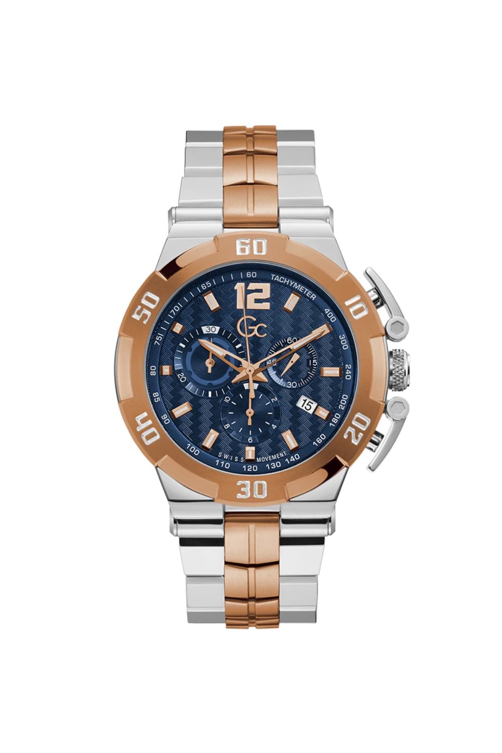 For the man who wants it all: the GC Y52007G7MF Structura Ultimate Chronograph blends bold design with Swiss precision. Its deep blue guilloché dial is framed by a rose gold PVD engraved bezel, with luminous rose gold-tone indices and oversized pushers for a commanding presence. The structured silver-tone case and tapered lugs flow seamlessly into a polished stainless steel bracelet, delivering both style and substance. With chronograph functionality, date display, and 100m water resistance, this timepiece is built for performance and elegance.