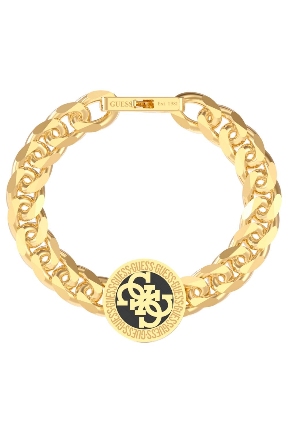 Bold and unmistakably branded — the Guess 4G Icon bracelet features a chunky gold-tone link chain and a raised circular emblem with interlocked “G” letters at the centre. The outer ring repeats the GUESS logo in a circular pattern, while the engraved clasp adds a finishing touch with GUESS EST. 1981. A confident choice for masculine styling, gifting, or standout accessorising.