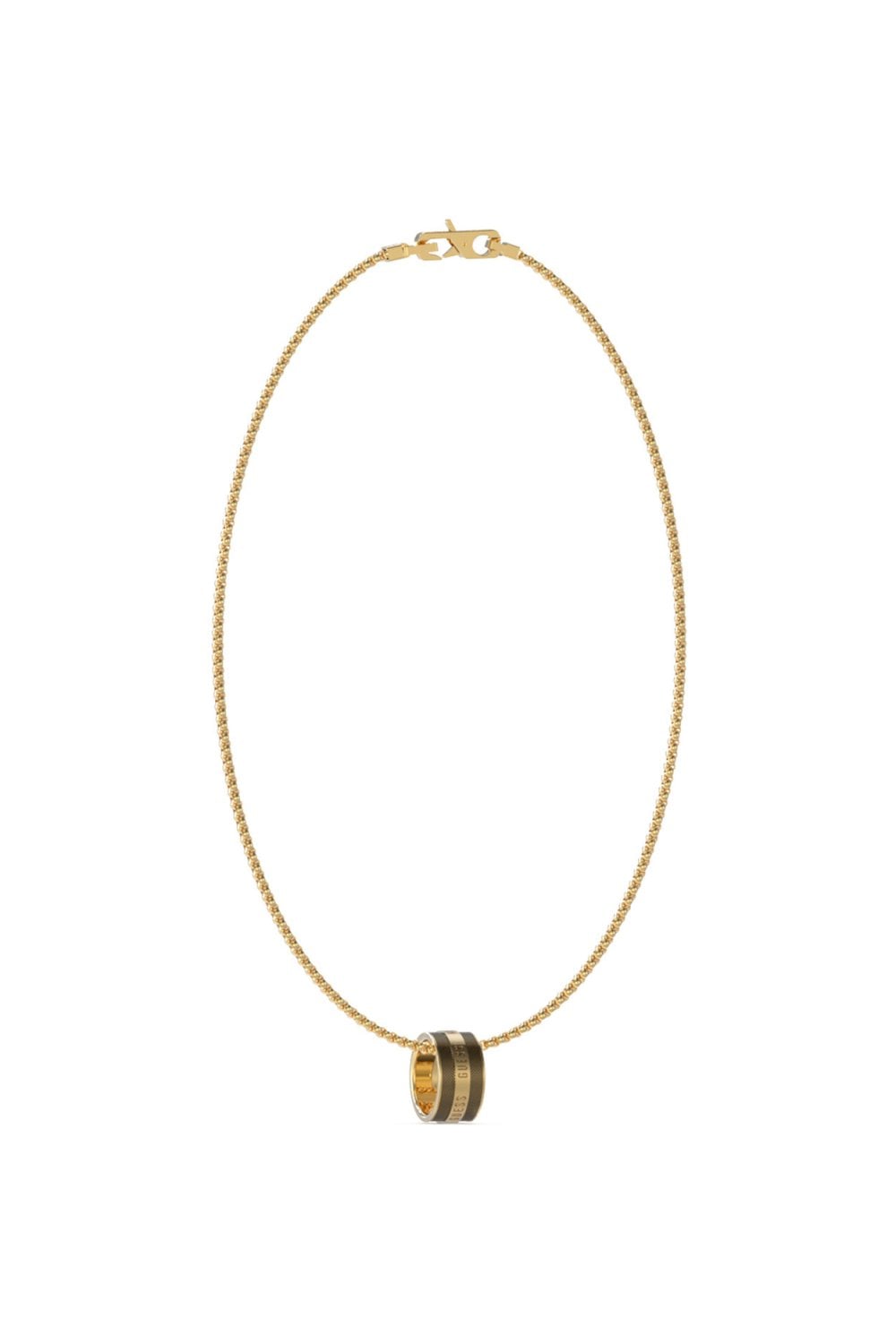 From the Legacy collection, this Guess men's necklace features a polished gold-tone curb chain and a bold ring-style pendant. The circular pendant showcases black textured detailing and engraved GUESS branding, delivering modern edge with signature style. A standout piece for layered or solo wear.