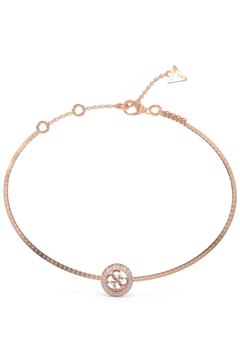 A polished rose gold-tone bracelet from Guess featuring a crystal-set 4G logo charm on a sleek box-link chain. Crafted in stainless steel, the chain spans approximately 146–210 mm with a secure lobster clasp and extender. The 2 mm chain offers a refined silhouette, while the 10 mm charm adds a sparkling focal point to this elegant everyday piece.