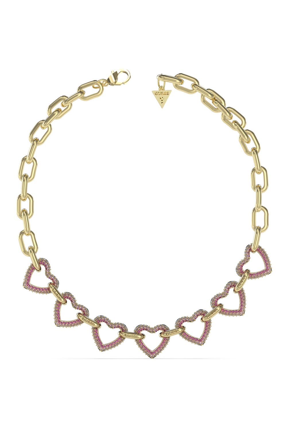 Fall in love with bold design — the Guess UBN05001YGPK necklace from the Beloved collection features interlocking heart-shaped links, each adorned with sparkling pink crystals, joined by chunky rectangular connectors. Finished in polished gold-tone with a secure lobster clasp, this piece blends playful romance with high-impact style.