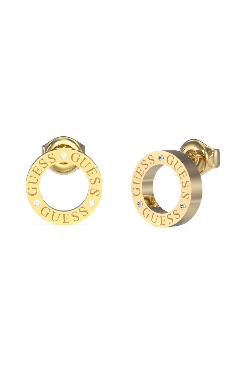 The Guess UBE03173YG Circle Lights Gold Plated 14mm Logo Stud Earrings are a stylish pair of gold-plated stainless steel earrings featuring a circle design with crystal-set detailing between each Guess logo. They fasten with a post and butterfly closure, ensuring a secure and comfortable fit. The UBE03173YG Guess ladies earrings are one of the many items available from our extensive selection of Guess products that we have in stock.