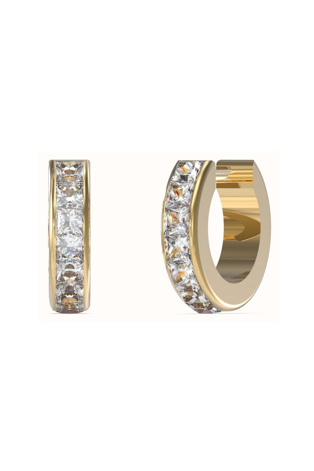 These compact Guess huggie hoops blend sleek gold-tone plating with a row of sparkling princess-cut crystals. Their polished finish and square silhouette offer a modern twist on classic styling—perfect for everyday elegance or layered ear looks.
