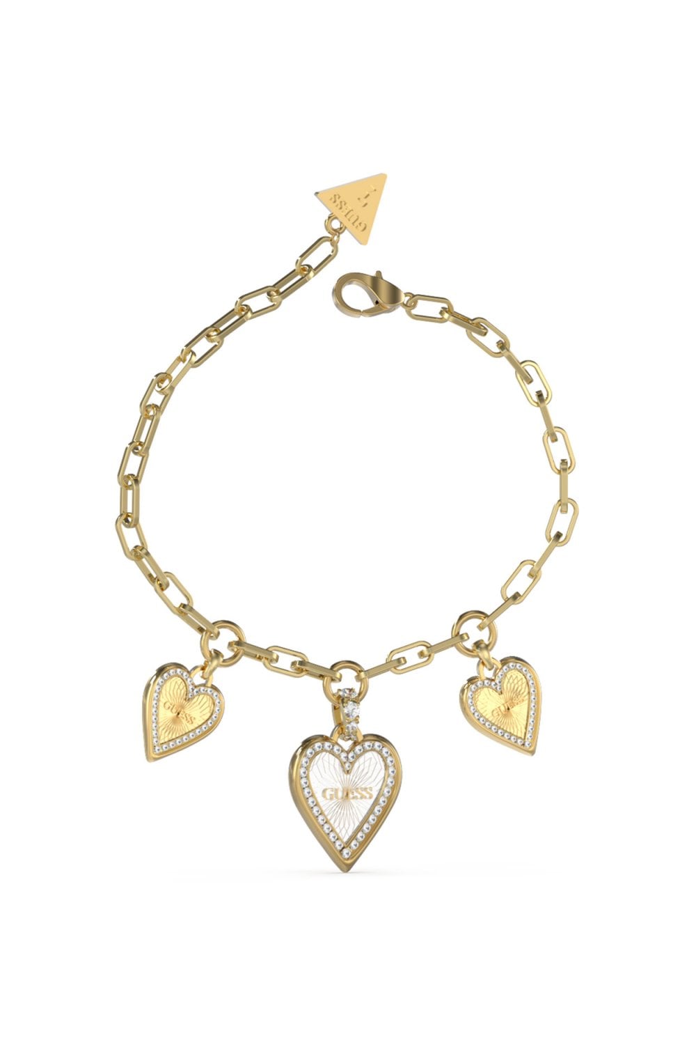 A gold-tone charm bracelet from Guess featuring three heart-shaped pendants, including a silver-tone centrepiece set with sparkling crystals. The stainless steel chain spans approximately 170–210 mm with a secure lobster clasp and extender, and its 3 mm width offers a bold yet elegant profile. Charm drops range from 14–18 mm, adding movement and shine to this romantic design.