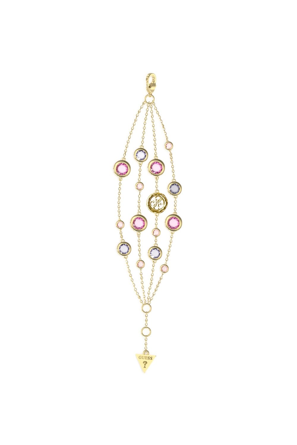 A polished gold-tone multi-strand bracelet from Guess featuring bezel-set crystals in pink, purple, and clear tones. The fine stainless steel chains span approximately 170–210 mm with a secure lobster clasp and extender. A central 4G logo charm anchors the design, measuring approx. 10 mm in diameter, while each strand adds a delicate 1.5 mm silhouette. This vibrant piece blends playful colour with signature branding in a layered, elegant form.