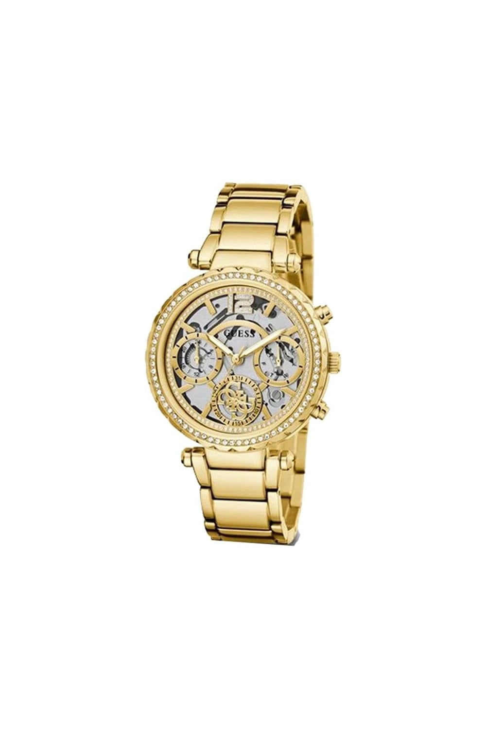 Guess Ladies watches are all about looking great. Each Guess watch reflects modern trends in true Guess style, with bold and irresistibly sleek designs available across the Guess collection. Add a new lease of life to your look with this Ladies Dress style watch from Guess. Featuring a stunning analogue skeleton face in a 36mm diameter 10mm thick case. Also boasting the well known Guess features, including Push/Pull Crown and Mineral Crystal Glass. With a fully adjustable PVD gold plated bracelet. This watch is splashproof. It also comes in it's own Guess Gift Box making it the perfect present. All this with a 2 year Manufacturers Guarantee for added reassurance. Guess offers high quality, affordable watches for Ladies in a fantastic range of styles from the contemporary to the classic.