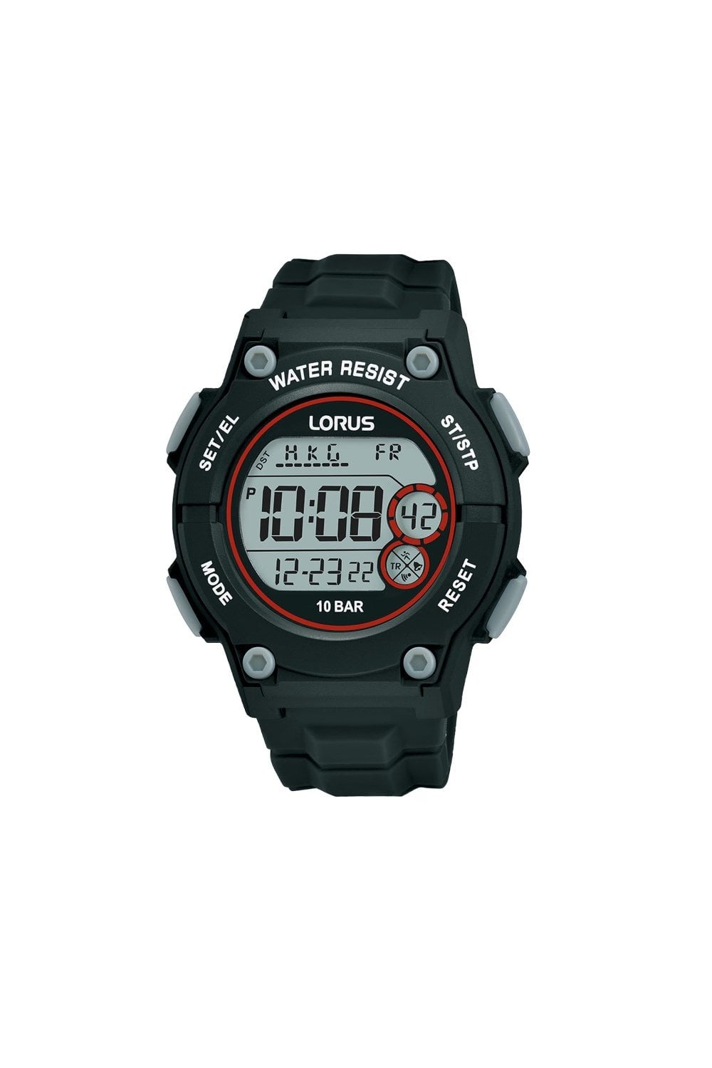 Add a new lease of life to your look with this Gents digital sports watch from Lorus. Featuring a superb digital face in a 42mm diameter 12mm thick case. Also boasting the well know Lorus features, including World Time Function, Day/Date Indicator, Alarm, Backlight, Stopwatch and Water-Resistant. This watch is water resistant up to 100 metres. Fitted with a standard length rubber strap and comes in a Lorus gift box with instructions and 2 year guarantee.