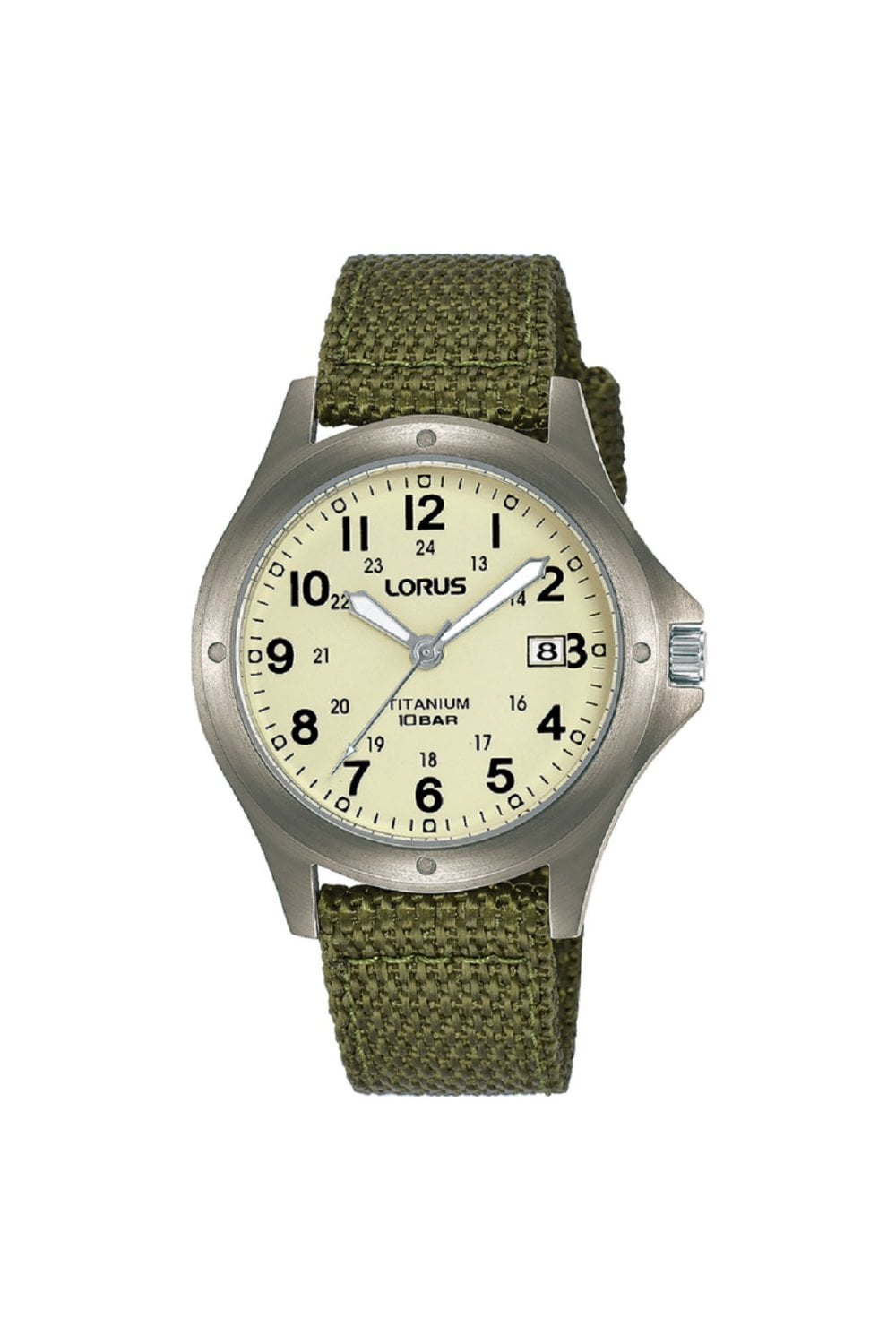 Add a new lease of life to your look with this men's Military style Titanium watch from Lorus. This is a reissue to the discontinued RXD425L8. Featuring a superb analogue Cream face in a 36mm diameter 8mm thick case. Also boasting the well know Lorus features, including Date Indicator, Luminous Hands, Mineral Crystal, Push/Pull Crown and Water-Resistant. With a military style webbing standard length strap. This watch is water resistant up to 100 metres, perfect for any watery tasks such as swimming. It also comes in it's own Lorus Gift Box making it the perfect present. All this with a 2 Years Manufacturers (International) warranty for extra peace of mind. Lorus offer a beautiful collection of watches for men with many features and the longevity you look for from Lorus.