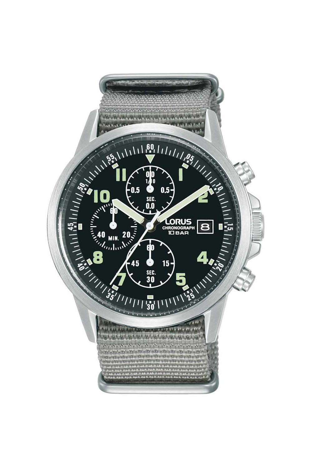 This stylish sports chronograph watch from Lorus features luminous hands and hour markers on a 42mm case with a stopwatch feature measuring up to 60 minutes in 1/10 second increments and also includes split time option. It has a date window, protected crown, and is complimented by a tough grey fabric strap to fit wrist up to 210mm. Created by Seiko Watch Corporation and exclusive to Rubicon Watch Company.