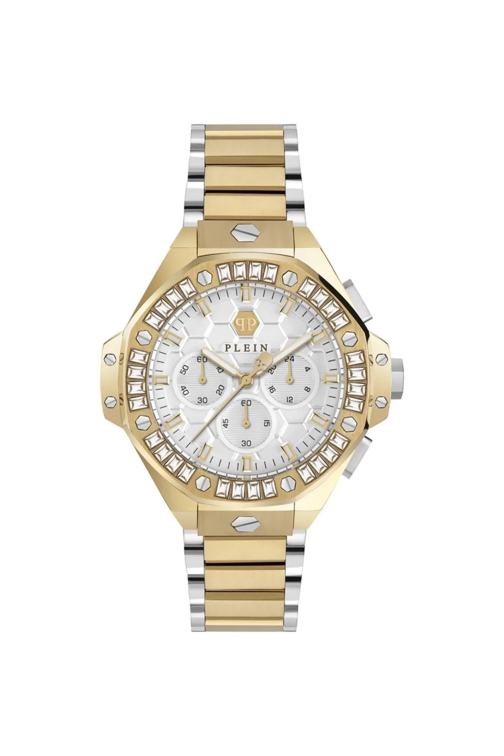 The Philipp Plein CHRONO ROYAL delivers a confident, high‑fashion look with its two‑tone stainless‑steel bracelet and crisp white dial. The sculpted 42mm case, bold indexes, and multi‑layer chronograph layout give it a powerful presence on the wrist, while the gold‑accented bezel and detailing add a refined luxury edge. Driven by a reliable quartz chronograph movement and built with 5ATM water resistance, it blends everyday practicality with unmistakable Plein attitude. A standout accessory for anyone who wants a watch that feels modern, expressive, and premium.