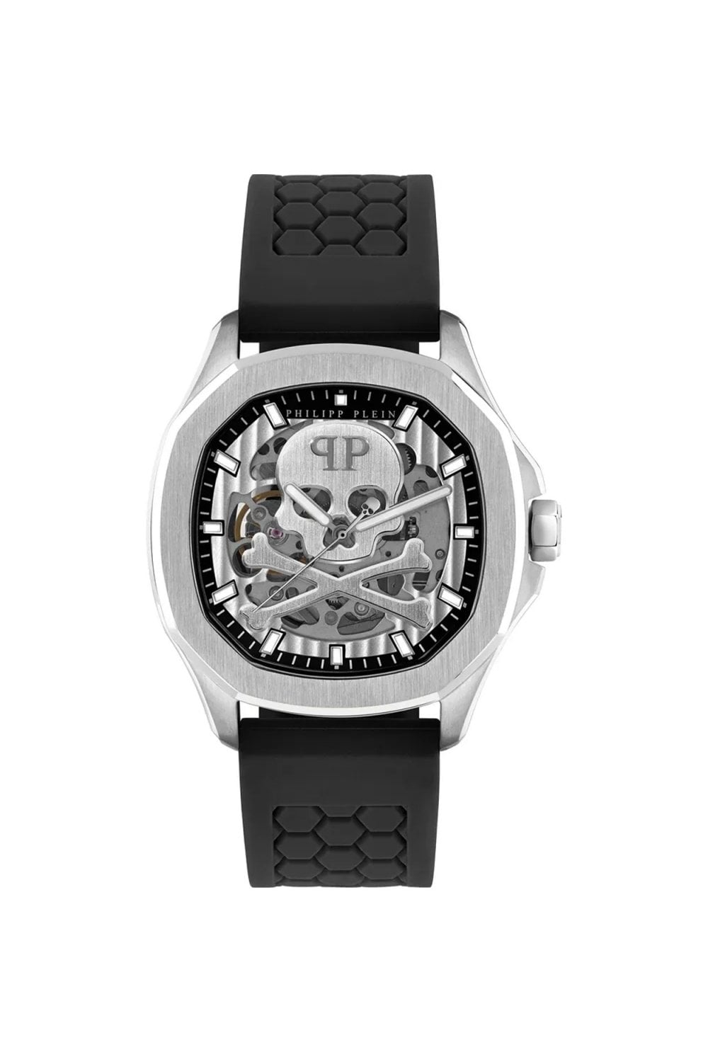 The Philipp Plein $KELETON $PECTRE High‑Conic brings bold, high‑impact styling to the wrist with its sculpted 42mm stainless‑steel case and open‑worked skeleton dial. The automatic movement is visible through the front, giving the watch a technical, high‑energy look that fits perfectly with Plein’s signature aesthetic. A black silicone strap adds comfort and sport‑lux appeal, while the mineral crystal and 5ATM water resistance make it practical for everyday wear. Confident, modern, and unmistakably Plein, this is a statement piece built for those who want their watch to stand out.