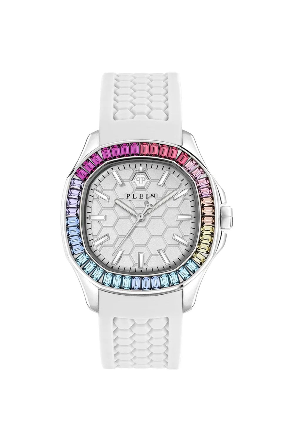 The Philipp Plein $PECTRE Lady High‑Iconic blends clean, modern styling with the bold attitude the brand is known for. Its sculpted 38mm stainless‑steel case frames a crisp silver dial with Plein’s signature detailing, creating a sleek, high‑fashion look. The white silicone strap adds a fresh, sporty edge while keeping the watch lightweight and comfortable for everyday wear. Powered by a precise quartz movement and built with 5ATM water resistance, it’s a confident, expressive accessory designed to elevate any outfit with effortless style.