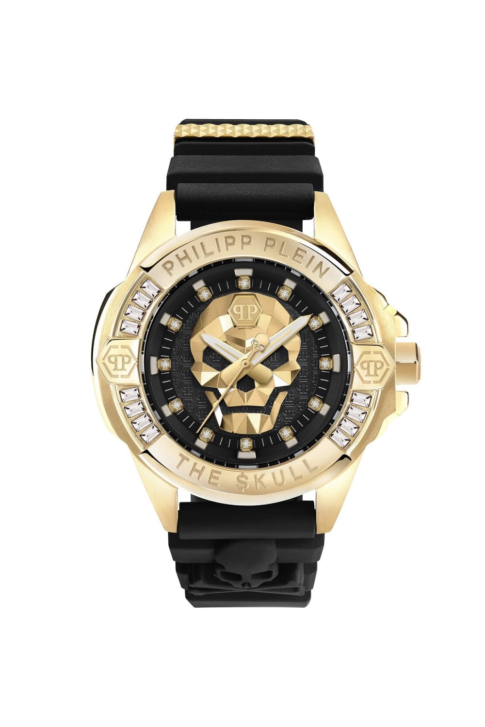 Make a golden statement with The $kull High Conic Unisex watch, where aggressive design meets refined luxury. This 41mm model is a show-stopper, featuring a polished IP gold-tone stainless steel case that provides a brilliant frame for the monochromatic black dial. At its heart lies the signature 3D faceted skull, a sculptural masterpiece that catches the light from every angle. The bezel is uniquely accented with shimmering baguette-cut crystals, adding a layer of sophisticated "glitz" to the brand's rebel aesthetic. Set on a high-grade black silicone strap for ultimate comfort, this watch is a bold, gender-neutral accessory for those who play by their own rules.