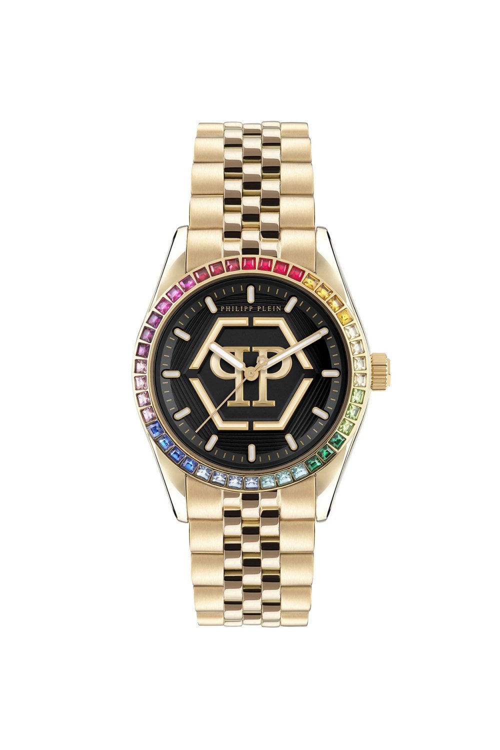 Redefine opulence with the Philipp Plein Date Superlative, a timepiece that captures the raw energy of high-fashion luxury. The 34mm gold-tone case is crowned by a spectacular bezel set with a vibrant gradient of rainbow baguette crystals, creating a prismatic halo of light. At the center of the textured black dial sits the iconic oversized Hexagon PP logo in polished gold-tone, a symbol of the brand's unapologetic "Street Couture" identity. Paired with a sophisticated five-link jubilee-style bracelet, this watch blends timeless jewelry aesthetics with the fearless, maximalist spirit that only Philipp Plein can deliver.