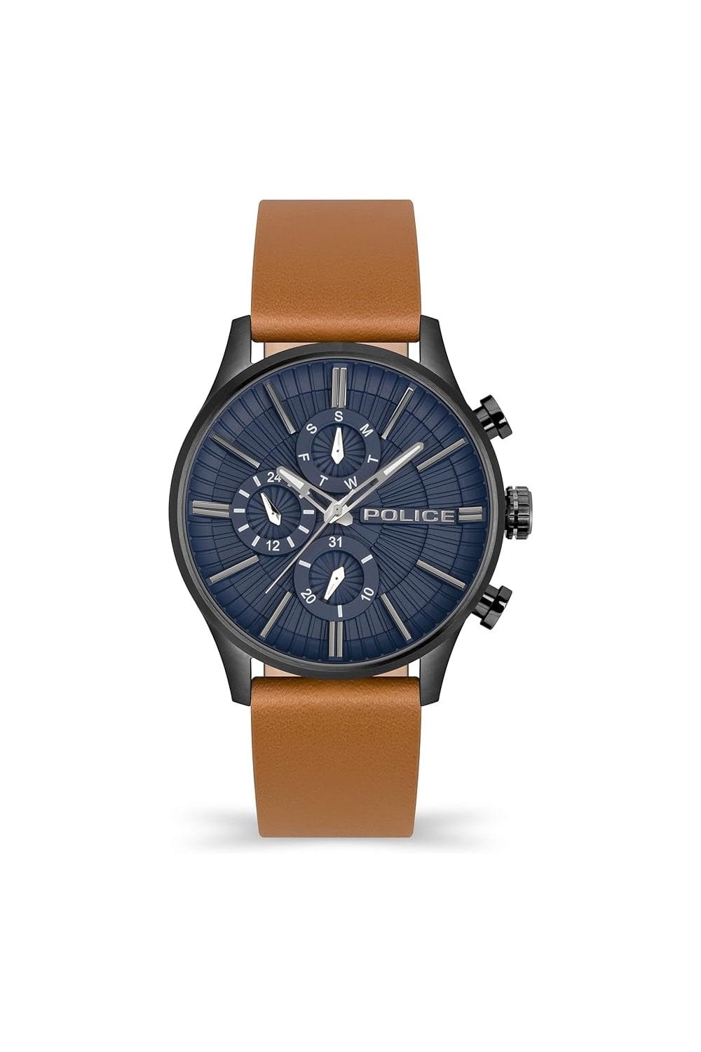 The Barter men’s multifunction watch features a stunning blue face in a 44mm diameter 12mm thick case. The watch features include; 24hr, day and date sub dials, push/pull crown, mineral crystal glass, crown protector, and water-resistant. The watch has a tan brown leather standard-length strap. This watch is water resistant up to 50 metres. The watch comes in the original Police gift box making it the perfect present with a 2-year manufactures warranty.