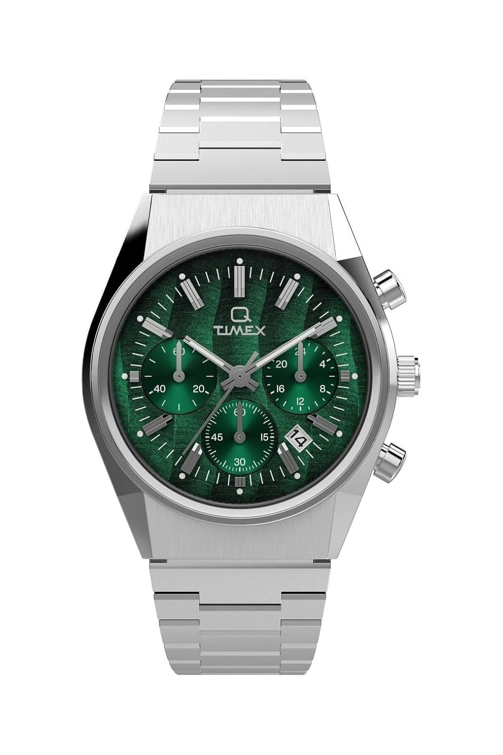 Following on the heels of our Q Timex 1979 Reissue, the Falcon Eye pays homage to its predecessor by mirroring some of the most quintessential details that you already know and love—a period-correct 40mm stainless-steel case and coordinating 3-link stainless-steel bracelet, dimensional applied indices, domed acrylic crystal, functional battery hatch, and date window. We’ve updated this refined timepiece with a chronograph movement for tracking elapsed time, but at the end of the day, it’s the striking green dial that steals the show, flashing a unique wave of texture with your every movement.