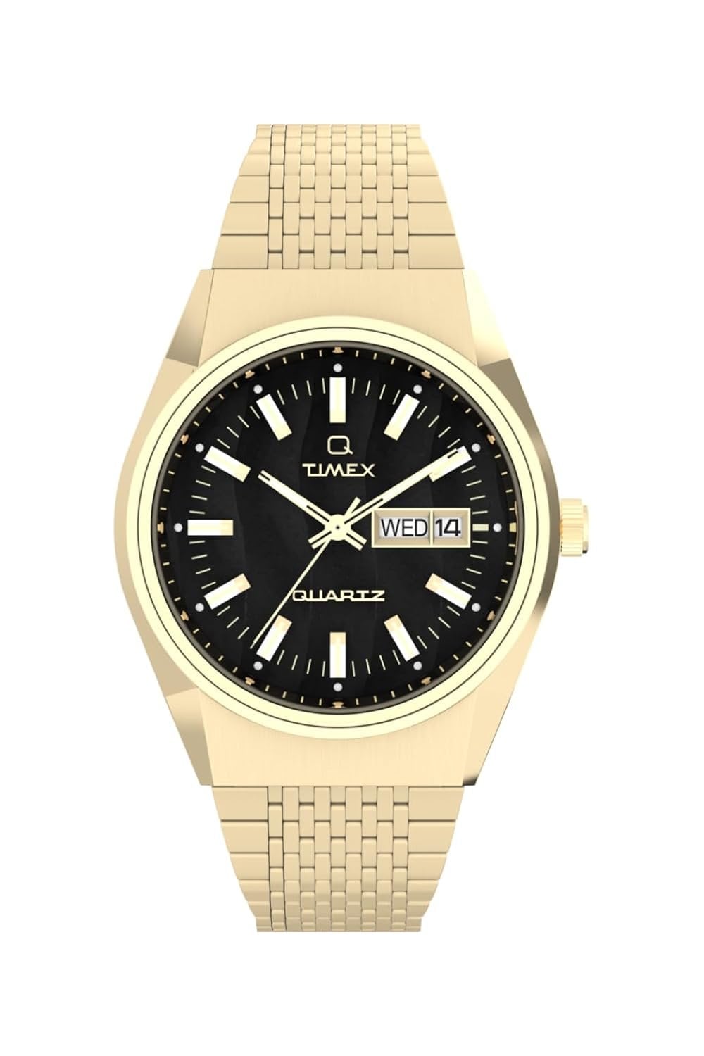 Following on the heels of our Q Timex 1979 Reissue, the Falcon Eye pays homage to its predecessor by mirroring some of the most quintessential details that you already know and love—a period-correct 40mm PVD plated stainless-steel case and coordinating 3-link PVD plated stainless-steel bracelet, dimensional applied indices, domed acrylic crystal, functional battery hatch, and date window. We’ve updated this refined timepiece with a chronograph movement for tracking elapsed time, but at the end of the day, it’s the striking black dial that steals the show, flashing a unique wave of texture with your every movement.