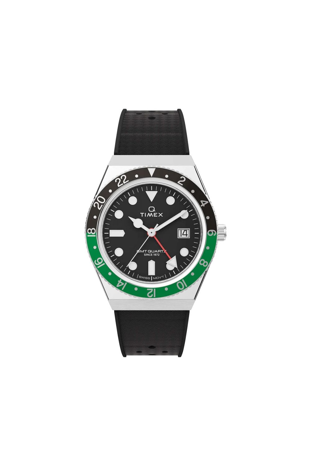 First released in the 1970s, our original Q Timex gave a new generation a modern watch with quartz technology. Now, our Q Timex GMT with a Ronda Swiss GMT movement—a natural evolution of the much-loved Q Timex 1979 Reissue—allows a new wave of jet-setters to set an additional time zone with its red and white GMT hand. We’ve updated its rotating bezel with a brilliant green accent, added perforation to its black synthetic rubber strap, and equipped it with a sturdy brushed and polished recycled stainless-steel case, yet iconic characteristics of the original—a black dial and a domed acrylic crystal—keep this reliable office GMT a time-honored classic.
