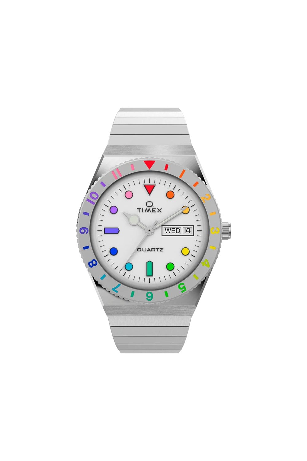 Look on the bright side with this vibrant iteration of our archival Q Timex. Influenced by the original dive-inspired designs from the age of quartz, we stayed true to the unique case silhouette, rotating top ring, and functional battery hatch of its 70s predecessor. Brilliant rainbow accents have been applied to the dial and bezel, which stand out against a chic all silver-tone background. On the wrist, this watch is as captivating as you might imagine; a silver-tone case is complemented by a silver-tone Perfect Fit expansion band with alternating rainbow links for a look and fit you’ll love.