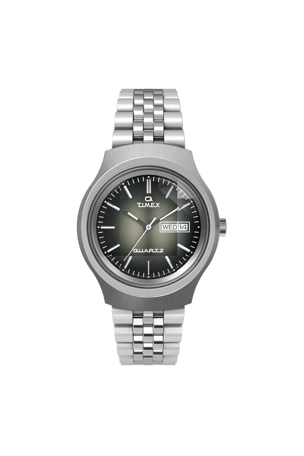 Our Q Timex Reissue Degrade is a stunning homage to one of our most iconic Q models from the late ‘70s. It remains faithful to the original design with a unique domed acrylic crystal boasting intricate interior facets that catch and refract light to produce a captivating illusion of depth and texture. As light hits the lustrous dégradé dial, a beautiful, complex display of smoky color is revealed. Its allure extends further with a sleek 38mm brushed stainless-steel case, matching stainless-steel bracelet, functional battery hatch, and a day and date window as the third hour marker. Keeping with its Q heritage, this timepiece boasts the precision of a quartz movement, ensuring impeccable accuracy for those on the move.