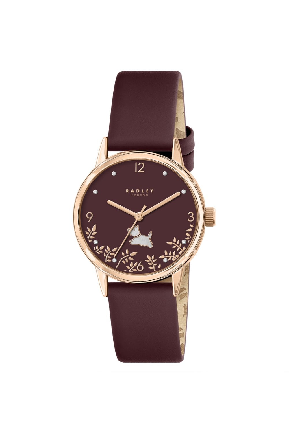 It has a 31mm round case and a burgundy dial featuring leaf detailing and the iconic Radley dog.