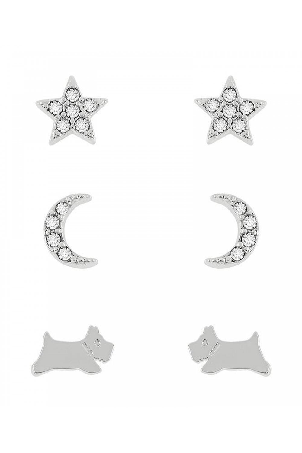 Radley Ladies Galaxy Street triple pack studded earrings. This set features a pair of silver plated iconic Radley jumping dogs with etched eye and collar detailing, a pair of stone set moons and stars. Includes Radley Giftable packaging.