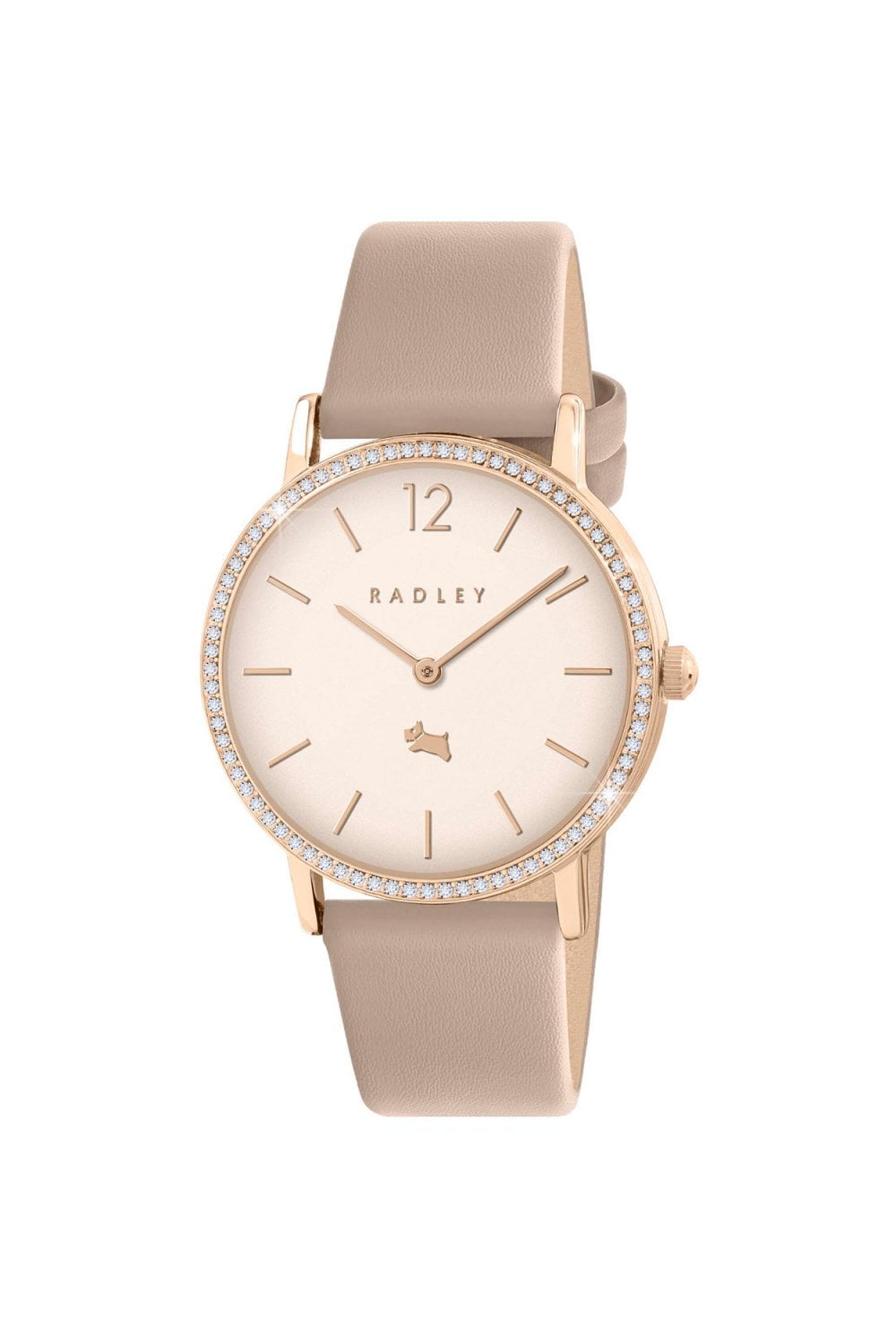 Radley Mill Bay Iconic Porcini Leather Strap. Iconic, the Mill Bay features a 35mm stone set polished rose gold case. Designed to dazzle, the warm rose gold satin dial creates a sophisticated and captivating look. The watch is finished with a warm porcini genuine leather strap and traditional polished rose gold buckle. Presented in a beautiful Radley London giftbox, with 2 year guarantee.