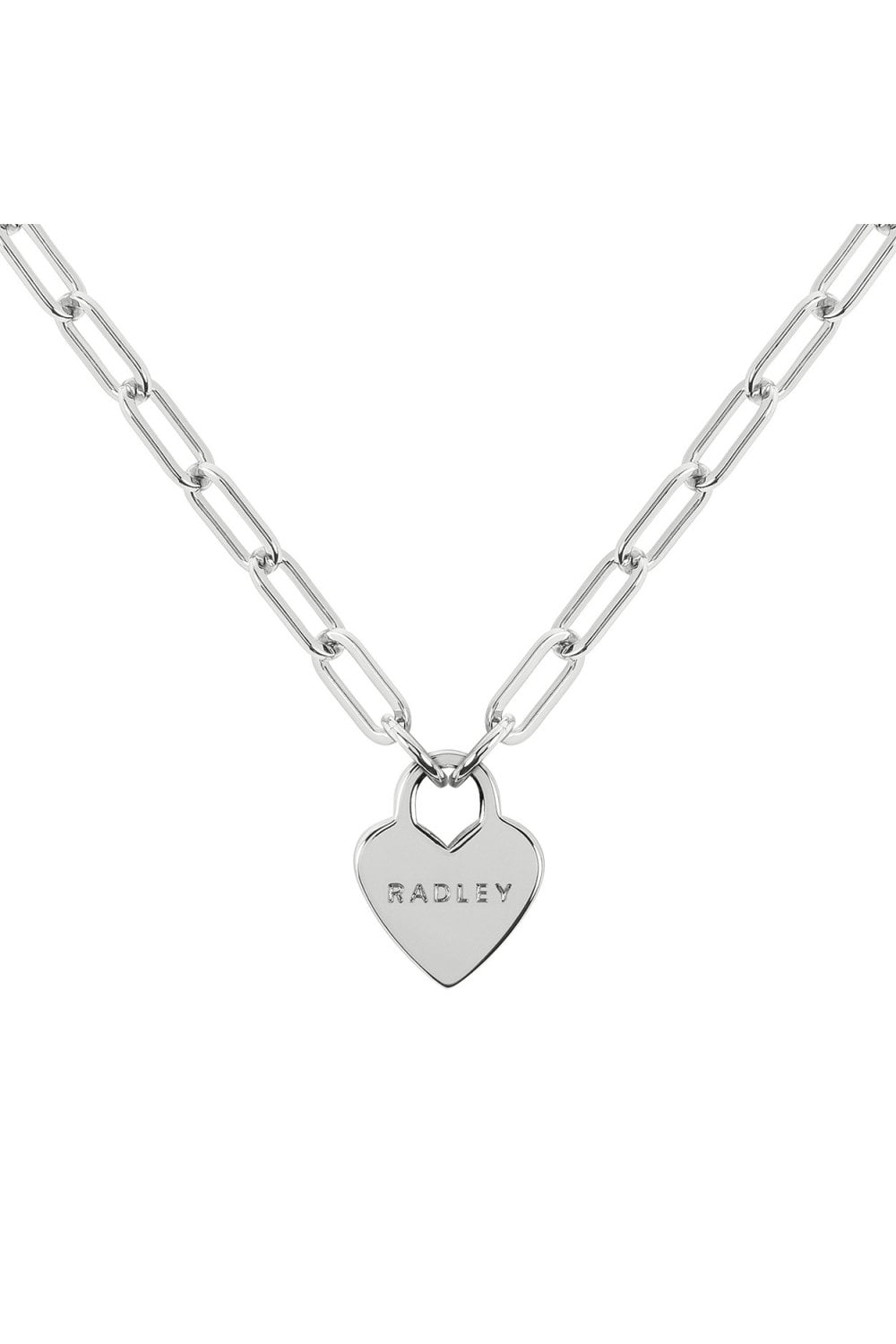 Radley Silver Plated Heart Charm Necklace. This necklace features a sleek paperclip-style chain finished in radiant silver plating. A delicate heart charm adds a touch of timeless romance, making it perfect for everyday wear or layering with your favourite pieces. Secured with a lobster clasp fastening for ease and comfort & combining classic design with contemporary style. Presented in a beautifully crafted, sustainably sourced Radley London gift box, ideal for gifting or treating yourself to a little golden luxury.