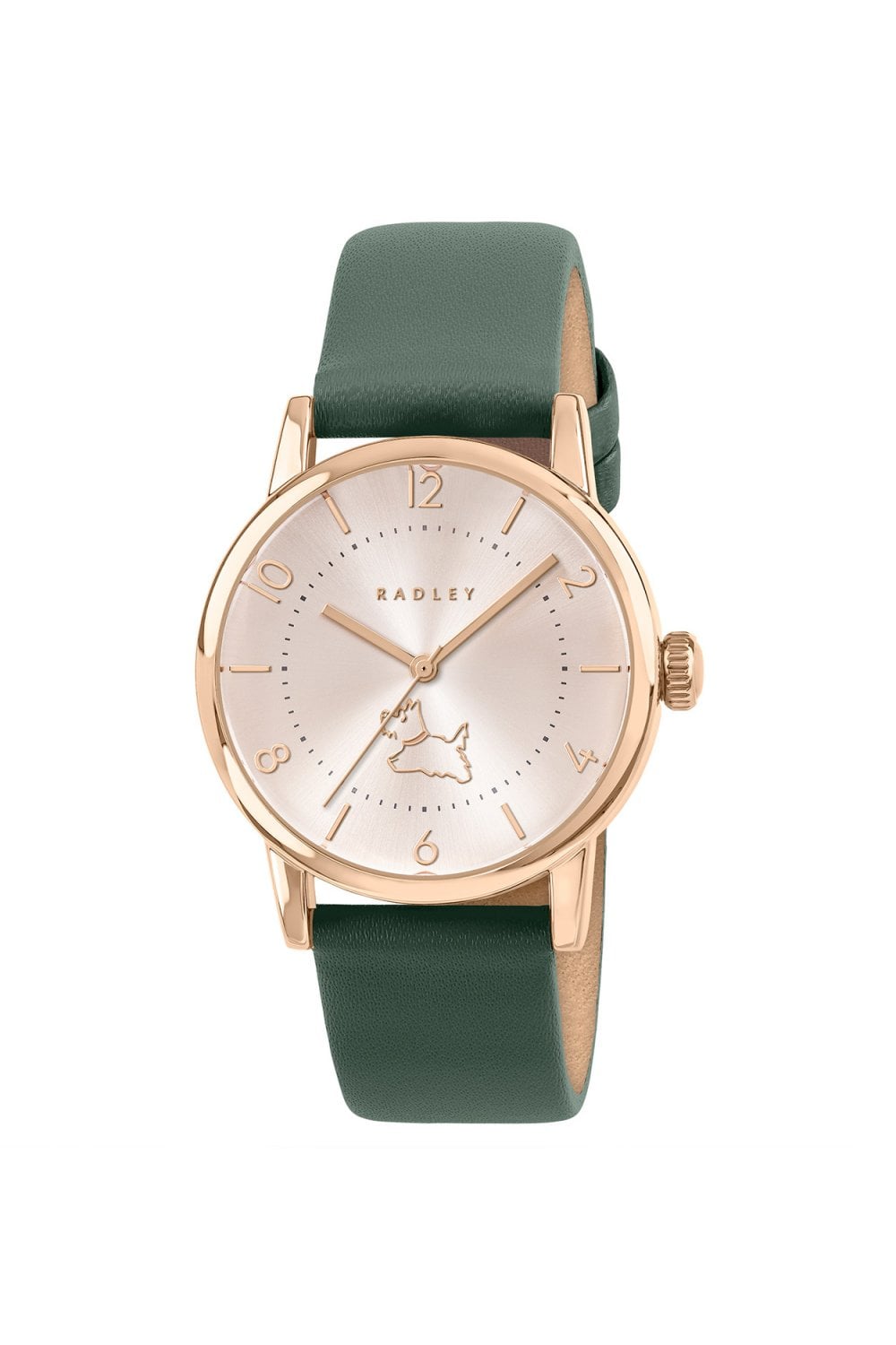Radley Spring Street Hunter Green Leather Strap Watch. Spring Street features round 35mm case fitted with a domed lens for the ultimate clarity. The polished rose gold case surrounds a warm rose gold satin dial with fine detailing. The Hunter green genuine leather strap adds a warm and sophisticated finish. Fastened with a tradtional polished rose gold buckle. Presented in a beautiful Radley London giftbox, with 2 year guarantee.