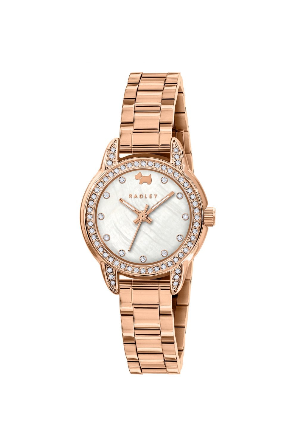 Radley Rose Gold Plated Stone Set Bracelet Watch. Featuring a petite 26mm rose gold plated case with stone set bezel and shoulders. The delicate mother of pearl dial is highlighted with rose gold detailing and is finished with an elegant rose gold plated stainless steel bracelet. Presented in a Radley London giftbox, with a 2 year guarantee.
