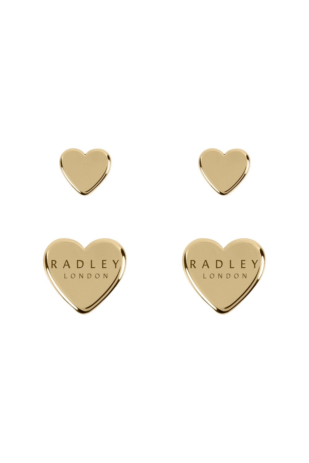 Radley Twin Pack 18ct Gold Heart Earrings. This gift set features two pairs of delicate 18ct gold plated heart earrings. Inclusive of two distinct heart designs and sizes with etched logo detailing. Presented in a beautiful, sustainably sourced, Radley London giftbox.