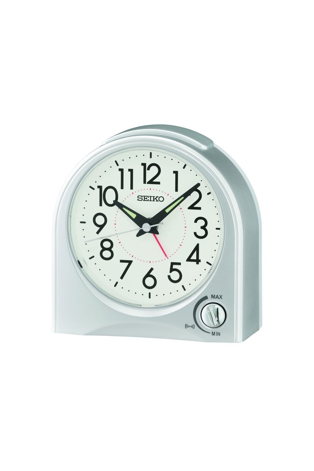 The Seiko QHE204S is a stylish silver-toned luminous bell alarm clock. It features a quiet sweep second hand, an ascending beep alarm, snooze function, volume control, and luminous hands for easy readability in the dark.