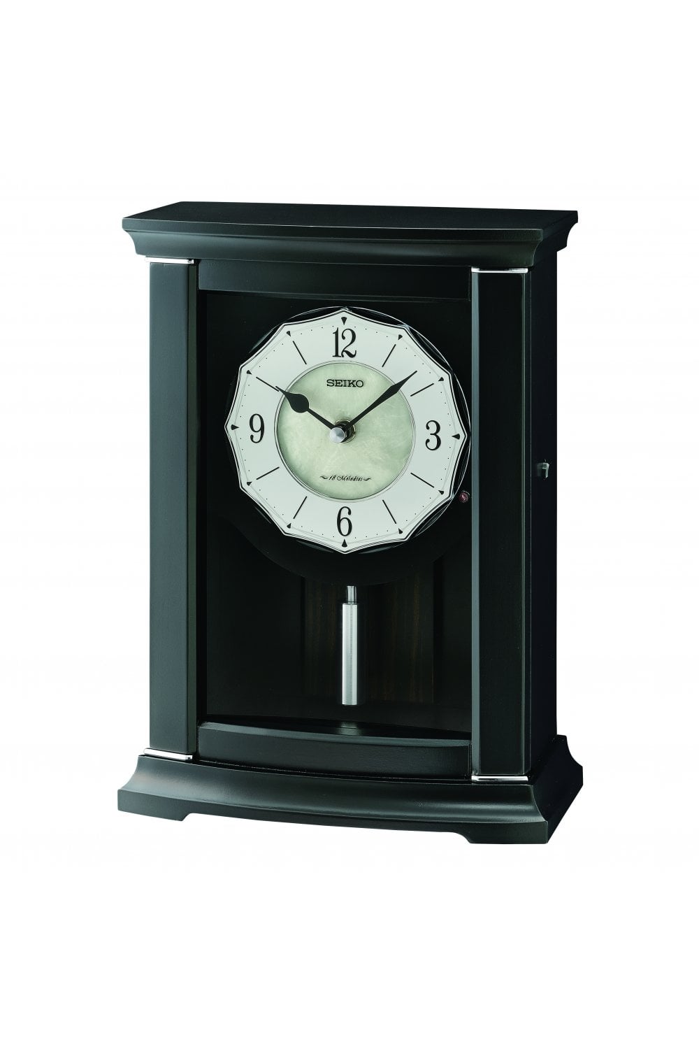 Seiko Dark Wooden Quartz Battery Musical Mantel Clock with Volume Control QXW250K Dark wooden case with silver tone detailing. Mother of pearl and white dial with silver tone edge and black Arabic numbers. Thick black plain hands makes the time easy to read. Quartz battery operated movement, supplied with 3 size AA batteries included. Choice of 3 musical melodies with a total of 18 tunes:- The Four Seasons 'Spring', Kanon, Eine Kleine Nachtmusik, Symphony No 6 'Pastoral', Morning From Peer Gynt, La Traviata 'Drinking Song' Amazing Grace, The Planets 'Jupiter', Waltz of the Flowers, Salut d' amour, Pictures at an Exhibition 'Promenade', Dance of the Reed Pipes Deck the Halls, O Tannenbaum, We Wish you a Merry Christmas, Joy to the World, Silent Night, Jingle Bells The clock has a number of additional features including volume control, from loud to silent. A demonstration button and a light sensor. The light sensor disengages all music when it becomes dark. For added piece of mind the clock comes with a Seiko 2 Year manufacturer’s guarantee.