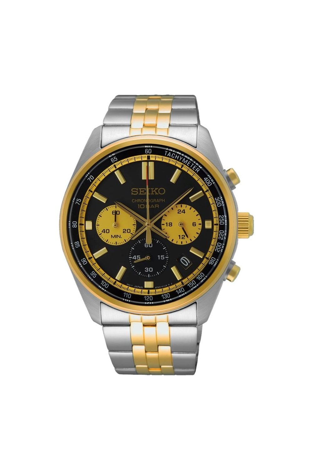 The SSB430P1 dress watch from Seiko. The SSB430P1 features a stunning analogue Black face in a 40mm diameter 12mm thick case. The Seiko SSB430P1 features include chronograph, 24hr Sub Dial, hardlex crystal glass, push/pull Crown, luminous hands and water-resistant. The SSB430P1 has a fully adjustable PVD Gold plated and stainless steel bracelet. This watch is water resistant up to 100 metres. The SSB430P1 also comes in its own Seiko gift box making it the perfect present. All this with a 2-year manufacturer's guarantee and instruction booklet. Seiko offers a great range of watches for men. All with the most up-to-date designs and long-lasting durability, whether they are in the fashion, sport or technical ranges.